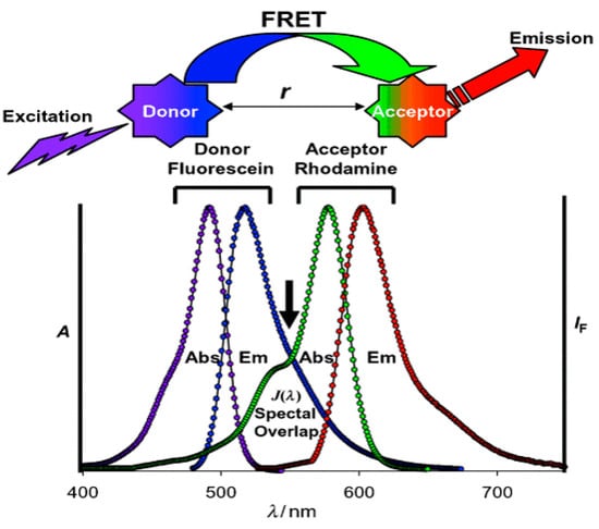 In 1949, Förster put forward a theory to describe long-range molecular interactions and derived the transfer rate equation related to the molecular distance and spectral properties [48], so fluorescence resonance energy transfer (FRET) is usually called Förster resonance energy transfer [49,50]. Through interactions between two dipoles, non-radiative energy transfer can be generated, as shown in Figure 3. As a quantum mechanical process, FRET occurs between two fluorescent groups, where energy may transfer from a donor (D) to an acceptor (A) molecule, leading to a reduction in the donor’s fluorescence intensity and an increase in the acceptor’s fluorescence intensity, accompanied by a corresponding shortening and prolonging of the fluorescence lifetime, respectively [51,52,53]. As an ideal donor–acceptor pair for a FRET system, the following four conditions should be met: Firstly, the emission spectrum of the donor should clearly overlap with the acceptor’s absorption spectrum. Secondly, the distance between acceptor and donor fluorophores should be controlled in the range of 1–10 nm. Thirdly, the emission dipole moment of the donor and the absorption dipole moment of the acceptor, according to the separation vector, should have a good mutual orientation. Last but not least, a donor with a high quantum yield is essential.