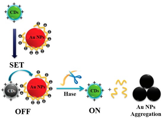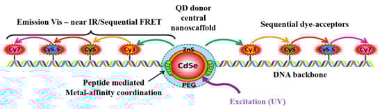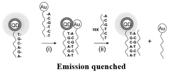Dvadyusha et al. [58] used the principle of FRET to design and synthesize a new approach for biosensing based on CdSe quantum dots (QDs) and AuNPs, as illustrated in Figure 4. They performed a hybridization of donor CdSe QDs to the functionalized 5′-end of the DNA strand through covalent bonds and acceptor AuNPs to the functionalized 3′-end. When the hybridization of two complementary strands of DNA occurs, FRET is generated because of the closer distance between the acceptor and donor. The number of complementary DNA chains without nanomodification increases by 10 times; some gold-modified DNA complementary chains are replaced, which prevents FRET when the distance between D-A pairs increases, and the fluorescence signal appears again.