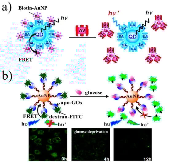 Dvadyusha et al. [60] first reported a method to inhibit the interaction between anti-biotin streptin-conjugated QDs and AuNP-conjugated biomolecules using FRET principles, as shown in Figure 5a. Using the interaction between streptavidin and biotin as a model system, QDs and AuNPs were coupled to these two biomolecules, respectively. The fluorescence of QDs is quenched by AuNPs when FRET occurs within the accessible distance through specific interactions. Furthermore, the addition of avidin-saturated biotin-AuNPs prevents the interaction between biotin-AuNPs and SA–QDs and separates them. The FRET effect cannot be generated, and the fluorescence of quantum dots reappears. Li et al. [61] developed a typical apo-Gox-modified gold nanoprobe for the high-sensitivity quantitative analysis of glucose and intracellular imaging research, as illustrated in Figure 5b. FRET led to fluorescence quenching between apo-Gox-modified gold NPs and dextran labeled with fluorescein isothiocyanate (FITC). Once glucose was present, it competed with dextran-FITC. Comparing the affinity of apo-GOx to glucose and dextran, the former is better, and the quenched fluorescence of FITC is recovered. The nanoprobe has a high sensitivity to glucose (detection limit as low as 5.0 nM) and fantastic selectivity.