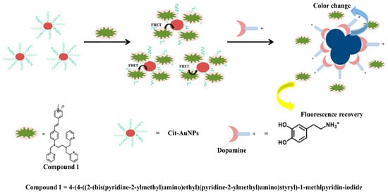 Peng et al. [63] constructed a novel nanoprobe combining AuNPs with a fluorophore for dopamine (DA) detection based on nitrogen fixation, which could achieve dual-signal detection with fluorescence and colorimetric methods, as depicted in Figure 6. With this new probe, the colorimetry can detect DA at concentrations from 0 to 300 M, while the lower limit of the fluorescence method is 0.29 M. The mechanism study showed that the interaction between the AuNP surface and DA’s catechol groups was the key factor for detection. The nanometer probe had good sensitivity and selectivity, and it could realize rapid DA detection.