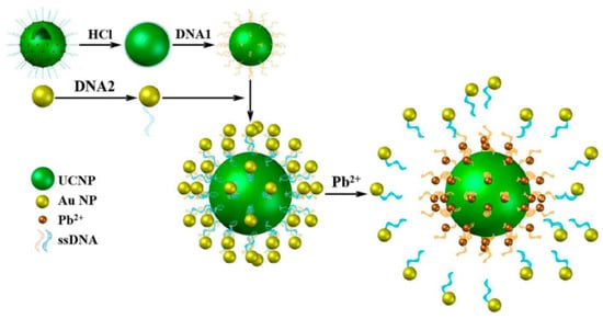 Similarly, a lead ion (Pb2+)-detecting sensor with high sensitivity was constructed by Wang et al. [64] on the basis of FRET between upconversion NPs (UCNPs) and gold NPs (AuNPs) as donors and acceptors, respectively. The FRET process was disrupted due to Pb2+-induced aptamers forming G-quadruplexes when Pb2+ is present in the environment, and the detection limit was as low as 4.1 nM, which demonstrated high selectivity in practical application, as shown in Figure 7.