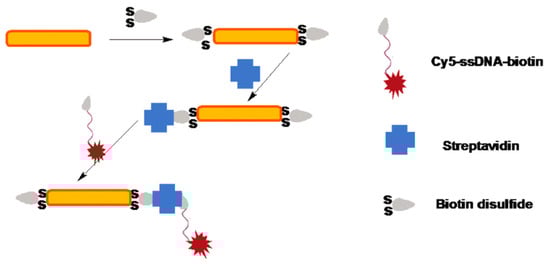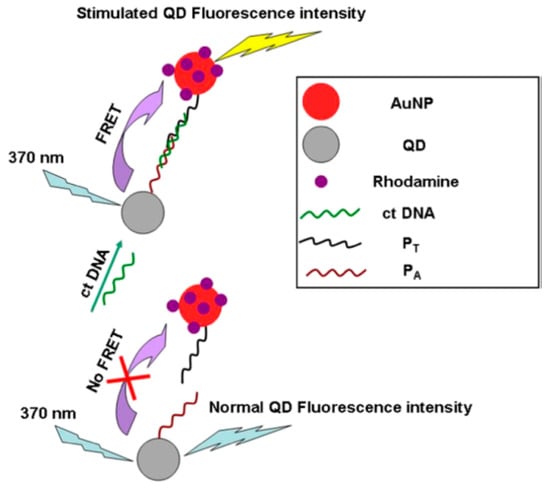 Sab. et al. [65] invented an oligonucleotide probe labeled with QDs and rhodamine-immobilized gold nanoparticles (AuNPs-Rh). The detection limit of this new sensitive nano-biosensor reached 3 × 10−8 M. This detection method is fast, simple and efficient, without excessive washing and separation steps, as depicted in Figure 8.