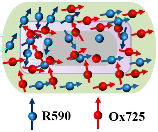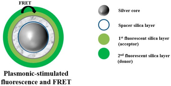 Wang et al. [73] constructed a Au nanorod@Ag core–shell nano-system coated with a SiO2 monolayer. Rhodamine 590 perchlorate (R590) and oxazine 725 perchlorate (Ox725), two dyes dispersed randomly in the SiO2 monolayer, were connected by chemical bonds, as illustrated in Figure 10. The FRET process can be selectively turned on or inhibited by regulating the plasmon wavelength: when the plasmon resonance wavelength coincides with the emission of the donor, FRET is inhibited. FRET is reactivated when the wavelength lies between the emission of the donor and acceptor or coincides with the emission of the acceptor.