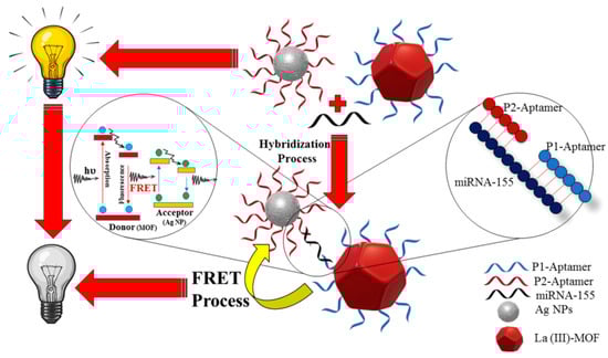 Afzalinia et al. [75] fabricated a biosensor based on the FRET technique and the “sandwich” hybridization of oligonucleotides, as illustrated in Figure 12. In the FRET process, AgNPs and a modified La (III)-metal–organic framework (MOF) were regarded as energy acceptor−donor pairs in the fluorescence quenching procedure. Under optimum conditions, the “turn-off” biosensor can detect the miRNA-155 biomarker at levels as low as 0.04 ppb or 5.5 fM.