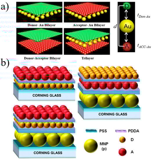 For a planar structure, using a layer-by-layer assembly technique, a polymer electrolyte is used as a spacer layer, which can effectively adjust to the distance between semiconductor quantum dots and the layers of the noble metal, which not only makes the adjustment of the layer more precise but also eliminates the influence of energy transfer inside the quantum dot layer, which is caused by an uneven size. Lunz et al. [74] first presented the LSP-mediated FRET process using a sandwich structure, which was composed of the acceptor QD–gold NP–donor QD. Figure 11 shows that the donor and acceptor layers are placed on both sides of the noble metallic layer. Through the reasonable adjustment of the spacing between layers, the Förster radius increased from 3.9 nm to 7.9 nm, the FRET efficiency was 8%, and the rate was enhanced by a factor of 80.