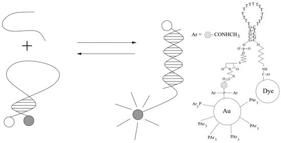 Two conformations of the gold-quenched molecular beacon and the dye–oligonucleotide–gold conjugate [10].