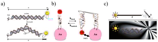 (a) Schematic drawing of the NSET system, which consists of gold NPs and fluorophores appended to dsDNA [81]. (b) Hairpin ribozyme of the docking and undocking transitions [83]. (c) Schematic diagram of a donor-dye–nanometal-acceptor pair separated by dsDNA [84].