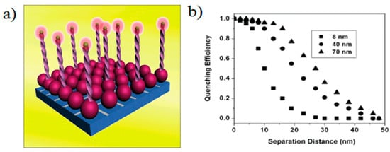 Zhang et al. [76] confirmed through experiments and verified by theory that, in this sandwich structure, the coupling between the donor and plasmon is dominant, which is demonstrated in Figure 13a. Tuncay et al. [77] placed the donor and acceptor layers on the same side of the metal nanoparticles so that coupling and energy transfer between NMNPs and quantum dots could achieve selective control. Furthermore, they also found that the non-radiative energy transfer enhanced by plasmon coupling was closely related to the location of coupled donor–acceptor pairs, as shown in Figure 13b.