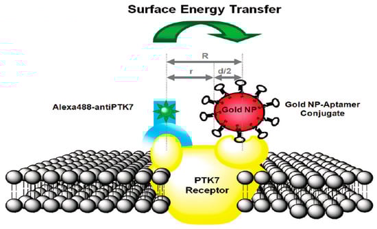 In the next year, 2010, Chen et al. [86] used gold nanoparticles with different diameters (from 5 to 42 nm) in order to change the distance R, which reflected the distance between the fluorophores at the antibody binding site and the NPs’ center at the aptamer binding site. They demonstrated the NSET system, which possessed long-distance and fast detection capabilities and a simple structure, and a “SET nanoruler” on the surface of living cells was defined. Figure 18 presents a drawing of the SET nanoruler.