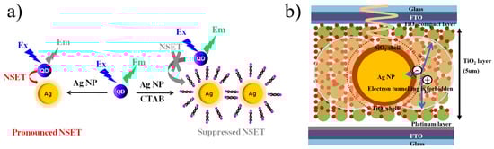 In 2015, Prajapati et al. [87] introduced 0.5 mM cetyltrimethylammonium bromide (CTAB) as a surfactant, which increased the distance between single silver nanospheres and silicon quantum dots (Si QDs), resulting in the inclusion of a double-layer CTAB aggregate, which was near the nanospheres, realizing the possibility of changing the NSET efficiency. Figure 19a depicts a schematic diagram of NSET between AgNPs and Si QDs. Cho Tung Yip et al. [88] demonstrated that the competitive relationship between non-radiative quenching induced by surface energy transfer and plasma-electromagnetic enhancement effects sensitized solar cells doped with dye, which has a metal–dielectric–semiconductor core–shell–shell nanoparticle structure. The dye molecule monolayer was chemically adsorbed to the outermost titanium dioxide (TiO2) shell. The LSPR of the metal core was excited by light and generated a strong plasmonic near-field around the core–shell–shell NPs, and it was expected that the absorption efficiency of the dye molecules would be significantly improved, as depicted in Figure 19b.