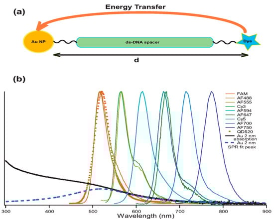 (a) Schematic drawing of relationship between NSET’s scale and distance. (b) Effect of distance between gold nanoparticle and Cy3 dye on quenching efficiency [85].