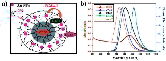 Mandal et al. [93] also obtained similar results. By using traditional steady-state spectroscopy, they observed the energy transferred from the surface of P123 to AuNPs. Figure 22a shows a schematic illustration of P123 micelles and probe molecules at different positions. Additionally, a good spectral overlap between the fluorescence spectra of micellar dyes and the LSPR band of gold NPs also satisfies the basic conditions for the occurrence of NSET from the donor dye to acceptor NPs, which is shown in Figure 22b.