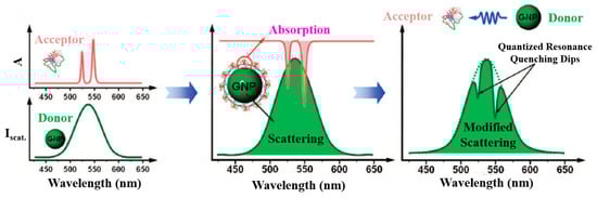 Owing to the special optical properties of noble metallic NPs, the signal can be captured at the level of only one particle by monitoring the change in plasmon resonance scattering in the process of energy transfer [45,46,47]. Furthermore, the ability of NMNPs to absorb light and convert it to heat makes them good candidates as donors or acceptors in the process of energy transfer. Next, this review will concentrate on the representative resonance energy transfer progress involving NMNPs and compare differences from the point of view of principles and applications.