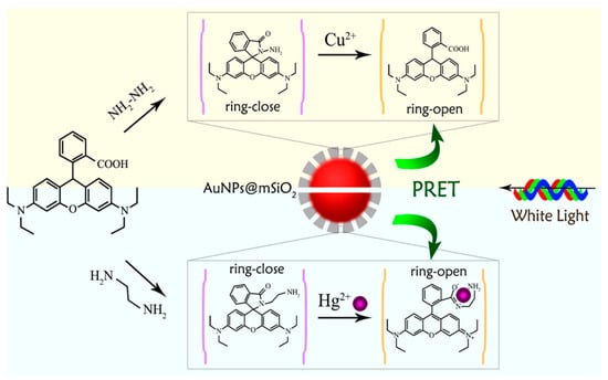 - Gao, M.X.; Zou, H.Y.; Li, Y.F.; Huang, C.Z. General sensitive detecting strategy of ions through plasmonic resonance energy transfer from gold nanoparticles to rhodamine spirolactam. Anal. Chem. 2017, 89, 1808–1814. [Google Scholar] [CrossRef] [PubMed]