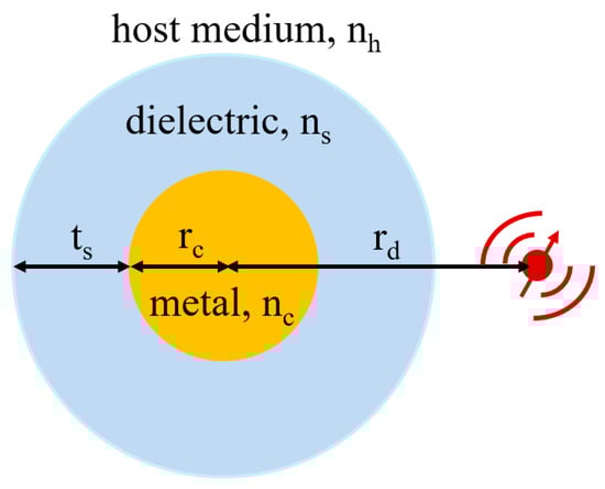 - Sun, S.; Rasskazov, I.L.; Carney, P.S.; Zhang, T.; Moroz, A. Critical Role of Shell in Enhanced Fluorescence of Metal–Dielectric Core–Shell Nanoparticles. J. Phys. Chem. C 2020, 124, 13365–13373. [Google Scholar] [CrossRef]