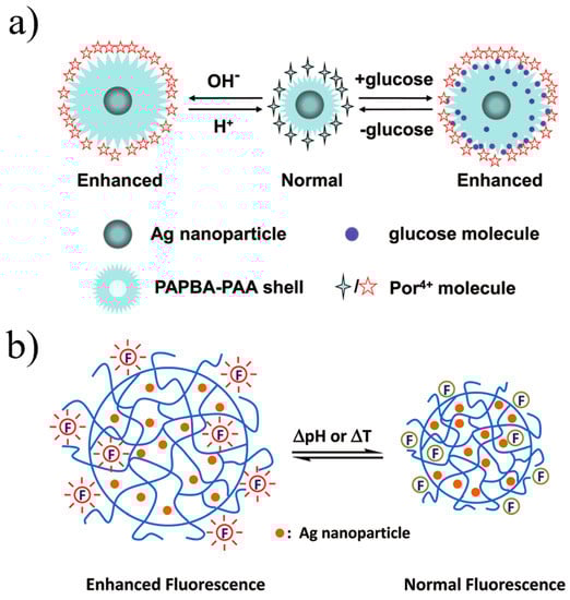 - Zhang, J.; Ma, N.; Tang, F.; Cui, Q.; He, F.; Li, L. pH-and glucose-responsive core–shell hybrid nanoparticles with controllable metal-enhanced fluorescence effects. ACS Appl. Mater. Interfaces 2012, 4, 1747–1751. [Google Scholar] [CrossRef]