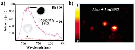 - Asselin, J.; Legros, P.; Grégoire, A.; Boudreau, D. Correlating metal-enhanced fluorescence and structural properties in Ag@ SiO2 core-shell nanoparticles. Plasmonics 2016, 11, 1369–1376. [Google Scholar] [CrossRef]