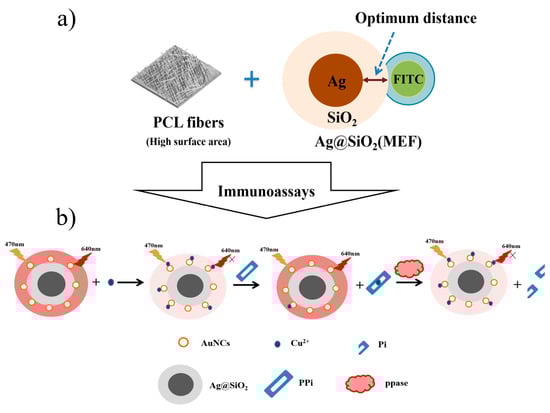 - Yun, B.J.; Kwon, J.E.; Lee, K.; Koh, W.-G. Highly sensitive metal-enhanced fluorescence biosensor prepared on electrospun fibers decorated with silica-coated silver nanoparticles. Sens. Actuators B Chem. 2019, 284, 140–147. [Google Scholar] [CrossRef]