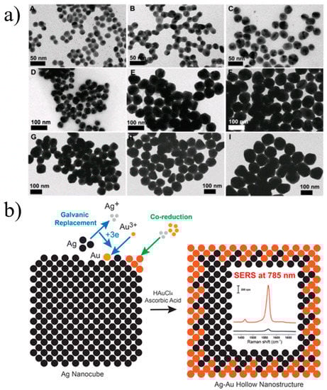 - Yang, Y.; Zhang, Q.; Fu, Z.-W.; Qin, D. Transformation of Ag nanocubes into Ag–Au hollow nanostructures with enriched Ag contents to improve SERS activity and chemical stability. ACS Appl. Mater. Interfaces 2014, 6, 3750–3757. [Google Scholar] [CrossRef]