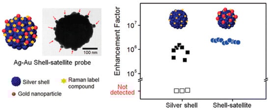 - Chang, H.; Kang, H.; Yang, J.-K.; Jo, A.; Lee, H.-Y.; Lee, Y.-S.; Jeong, D.H. Ag Shell–Au Satellite Hetero-Nanostructure for Ultra-Sensitive, Reproducible, and Homogeneous NIR SERS Activity. ACS Appl. Mater. Interfaces 2014, 6, 11859–11863. [Google Scholar] [CrossRef] [PubMed]
