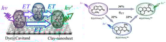 - Tsukamoto, T.; Ramasamy, E.; Shimada, T.; Takagi, S.; Ramamurthy, V. Supramolecular surface photochemistry: Cascade energy transfer between encapsulated dyes aligned on a clay nanosheet surface. Langmuir 2016, 32, 2920–2927. [Google Scholar] [CrossRef] [PubMed]