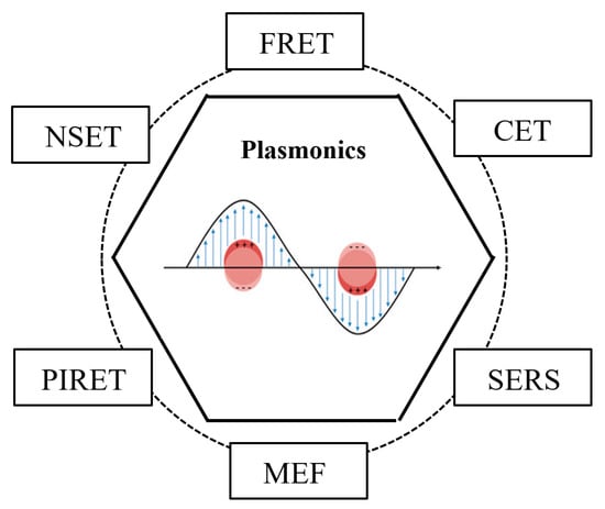 In energy transfer involving NMNPs, most of the energy donors are inorganic semiconductor quantum dots or organic fluorescent small molecules, while gold and silver NPs can be regarded as both donors and acceptors. The common energy transfer techniques, which can be divided into fluorescence resonance energy transfer (FRET), nanometal surface energy transfer (NSET), plasmon-induced resonance energy transfer (PIRET), metal-enhanced fluorescence (MEF), surface-enhanced Raman scattering (SERS) and cascade energy transfer (CET), have been widely applied and investigated in numerous fields. Among them, FRET describes the physics of energy transfer between two photosensitive molecules, facilitating real-time dynamic research on molecules under a variety of physiological conditions, but it is usually blind to distances above 10 nm, thus hampering the study of phenomena over long distances [31,32]. NSET has good selectivity for representative metal ions, and it shows unique sensitivity when the distance is more than 10 nm [33]. PIRET involves a strong localized electromagnetic field and the ability of plasmonic nanoparticles to concentrate the light field, which makes them efficient energy donors for constructing transfer systems [34]. Due to the resonance between metallic NPs’ surface plasmons and fluorescent molecules, MEF is regarded as a mirrored dipole, with high sensitivity and efficiency [35]. SERS provides a larger surface area for sites of electromagnetic enhancement, with good biocompatibility and easy modification [36], while in the CET system, the roles of the energy donor and acceptor are no longer fixed, and it is extremely crucial for lower costs and lower energy consumption in research [37].