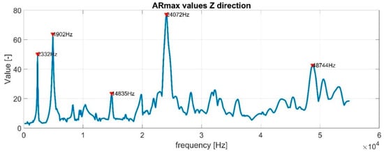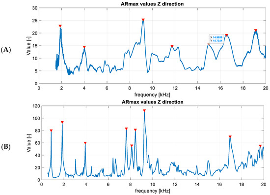 Four datasets for the detection of out-of-plane LDRs were examined. The results were derived from experiments with a piezoceramic transducer, a modal shaker (described in Section 3.2) and the numerical results (2D and 3D FE models defined in Section 3.3). The determined ARmax characteristics for datasets were computed and analyzed, and finally LDR frequencies were found by the proposed algorithm. Exemplary results of the ARmax index for experimental data and the 3D numerical model are presented in Figure 8. Similar results were computed for the 2D numerical model, but are not presented here to limit the manuscript’s size. The maximum number of peaks to be detected in the algorithm was limited to nine. The LDR frequencies determined by the algorithm are marked with red triangles.