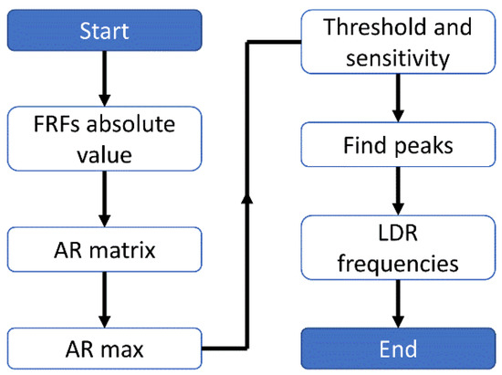 To sum up, the algorithm works as follows: the FRF computed for measured or simulated data is the input for the algorithm. Firstly, the absolute value of FRF is computed. Next, the AR matrix is calculated according to Equation (1) and the ARmax index is calculated as introduced above. Then, the peaks of the ARmax are found, taking into account threshold and sensitivity presets. Frequencies corresponding to those peaks are interpreted as LDR frequencies.