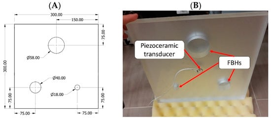 The test sample made of poly(methyl methacrylate) (PMMA) was manufactured for the experimental testing of the algorithm’s operation. The dimensions of the plate are as follows: 300 × 300 × 18 mm. Damages of FBH-type were introduced in the plate to represent three sizes of deep defects with nominal diameters of 58, 40, and 18 mm. The designed depth of all FBHs was 17 mm, which corresponds to the 1 mm thickness of the residual material in the damaged area. The test specimen’s dimensions are presented in Figure 3A. Please note that the sample is presented from the intact-side view, while in Figure 3B the manufactured sample is presented from the damaged-side perspective.
