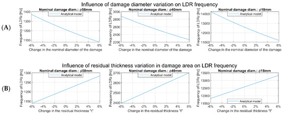 Figure 4. Influence of damage diameter (A) and residual thickness (B) variation on theoretical LDR frequencies calculations made for the design values of FBH dimensions.