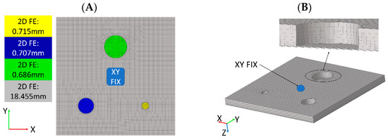 Figure 6 presents the FE mesh used in the 2D and 3D numerical models. The geometric dimensions of the model correspond to the measured ones. The thickness of shell 2D FEs corresponds to the thickness of the material in a given area of the sample. The thicknesses of shell FEs used in the 2D model are described in the legend in Figure 6A. The influence of the piezoceramic transducer was modeled as constraints in X and Y directions on the transducer’s montage side. The division of elements in the XY plane is the same in both models.