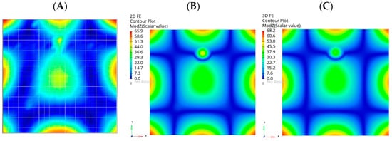 The obtained results confirm a good agreement of the numerical model formulated with 3D FEs with the experimental results. The maximum error was observed for the normal mode marked as ‘B’, which was less than 5% between the model and experiment. This error is more significant for the model made of 2D FEs, and amounts to a maximum of 7.6% for the ‘C’ normal mode. The model made of 3D FEs can be considered to be more accurate. It should be noted that the thickness of the test sample in numerical models was assumed to be constant, but in reality it most likely varied over the sample, which may be the reason for the discrepancy between numerical results and experimental ones in global normal modes.