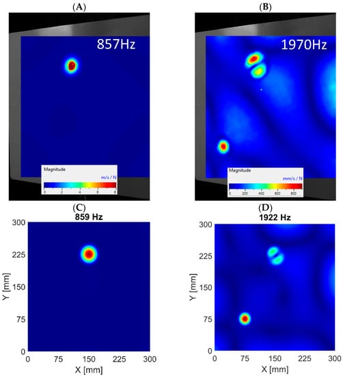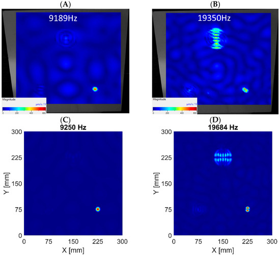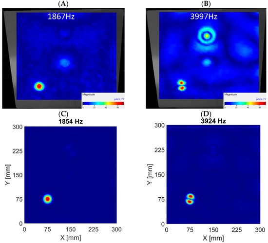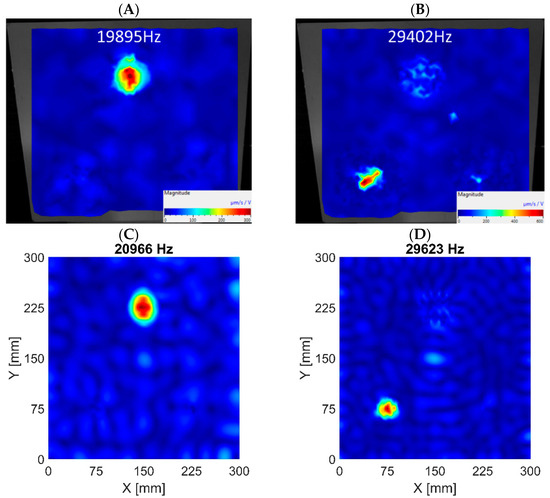 Figure 11. Visualization of out-of-plane vibrations—FBH Ø18 mm. The first LDR in experimental data (A) and numerical results based on the 3D FE model (C). The second LDR in experimental data (B) and numerical results based on the 3D FE model (D).