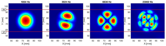 The higher order out-of-plane LDR modes allowed for a more accurate identification of the FBH damage size. Figure 12 presents a visualization of the detected out-of-plane modes of FBH Ø40 mm using the discussed algorithm. The view was limited only to the damaged area. The algorithm’s sensitivity was increased to 24 peaks across the entire frequency spectrum. It allowed for the identification of higher out-of-plane LDRs of the FBH Ø40 mm damage. Horizontal lines were drawn to allow the quantification of the damage size based on the shape of the highest noted mode (23,062 Hz). The determined size of the damage was Ø37 mm. This indication was therefore underestimated in relation to the nominal damage diameter by 3 mm. Nevertheless, the lower modes underestimated the damage diameter to a much greater extent. The first out-of-plane mode, especially, underestimated the damage diameter by about 15 mm, which resulted in a damage size of Ø25 mm.