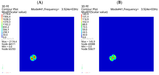 Although the analysis concerned in-plane modes, most detected resonance frequencies corresponded to out-of-plane modes of LDRs. Further investigation showed that out-of-plane modes are, in fact, always accompanied by increased vibrations in the in-plane directions, as presented in Figure 13, where for the same eigenvalue (3925 Hz) the out-of-plane (Figure 13A) and in-plane (Figure 13B) vibration components are depicted.
