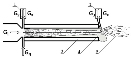 The schematic view of the catalytic fibre production process. 1—the feeder of particles; 2—the feeder of catalytic particles; 3—reactor walls cooled with water; 4—melt flow; 5—produced fibers and granules; G1—air plasma flow from plasma torch; G2—air flow for injection of ceramic materials; G3—air flow for spraying of catalytic particles; Gc—flow of catalytic particles; Gg—propane gas flow; Gz—flow of particles.