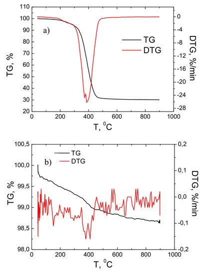 As it can be seen from the results of the measurement, the main process of weight loss of the material took place in the temperature range of approximately 300–500 °C. In this temperature range, the total weight of the primary powder decreased by about three times and reached about 30% of the weight of the starting material. This process is associated with a reduction in carbon content with an increase in temperature. This result correlated well with the EDS studies when the carbon content of the primary powder was about seven times higher than that of the fiber. The DTG curve shows that the most intense material loss process occurred at 400 °C when the material loss rate was about −28%/min. Figure 3b shows the results of the thermogravimetric study of the fiber. As the temperature was raised from 0 to 900 °C, the total mass of the material varied slightly—it decreased by about 1.5%. This result was because the fiber was free of volatile compounds and the carbon content was reduced up to seven times compared with the original powder.