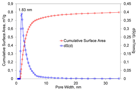 Figure 6 presents the results of the BET measurements of the primary powder. As the analysis of the results shows, the specific surface area of the powder was 1.25 m/g2. The best suited calculation model for the evaluation of the pore size distribution in a specimen was QSDFT, N2, carbon equilibrium transition kernel at 77.4 K based on a slit-pore model, with a calculation fitting error equal to 3.270%. The largest total surface area was occupied by pores with a diameter of 1.83 nm. It is apparent that the predominant range in which the pores were distributed was from 1 to 10 nm. It is worth mentioning that the characteristics of the porous structure depended on the method of preparation of the primary powder. It also depended on the fraction obtained from the powder and the geometric shape of the granules.