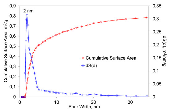 Figure 7 presents the results of BET studies of the obtained fibers. The studies were performed under the same conditions as for the primary powder. In this case, the specific surface area was 1.04 m/g2. The most common pore width value was equal to 2 nm. It can be observed that the predominant range in which the diameter of the pores were distributed was 1–20 nm. It can be stated that the process of fiber formation had a small influence on the changes of the specific surface area and the porosity structure.