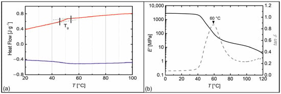 For their therapeutic use, aligners must have suitable thermomechanical properties. In addition, it is advantageous for aesthetic reasons if they are clear and virtually almost invisible. For these reasons, a thermoplastic polyurethane (TPU) having a non-crystalline, amorphous soft segment of polypropylene glycol (PPG) with a low molecular weight of about 430 g·mol−1 was selected. The counterpart was the hard segment, which was obtained from the reaction of 4,4′-diphenylmethane diisocyanate (MDI) and 1,4-butanetiol (BD). The ratio of hard to soft segments was 0.6/0.4. The prepolymer method was used to synthesize a similar poly(ether urethane) as recently developed for four-dimensional (4D) printing to enable thermally inducible assembly processes []. Fourier-transform infrared (FT-IR) spectroscopy was employed to verify the completeness of the polyaddition reaction (Figure S1, Supplementary Materials). Here, the characteristic vibrational modes of a poly(ether urethane) were detected. In addition, only a weak signal at 2270 cm−1 associated with the presence of freely available isocyanate appeared in the spectrum, indicating that the reaction was largely completed. Differential scanning calorimetry (DSC) and dynamic mechanical analysis (DMA) were used to study the thermal behavior, as well as the temperature-dependent mechanical properties of the TPU (Figure 1).