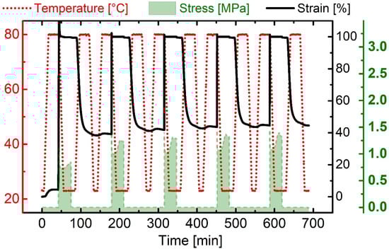 Cyclic DMA measurement protocol for PPG-based TPU. The individual parameters included Thigh = 80 °C, Tlow = 23 °C, and εmax = 100%. The evolution of temperature (red dotted), stress (green area), and strain (black line) were recorded for five cycles.