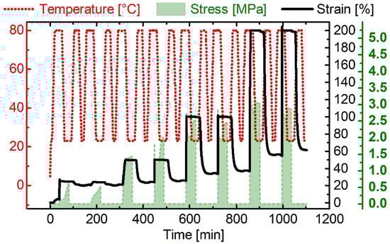 Cyclic DMA measurement protocol for PPG-based TPU (Thigh = 80 °C, Tlow = 23 °C, εmax = 25%, 50%, 100%, and 200%). The evolution of temperature (red dotted line), stress (green area), and strain (black line) are exhibited.