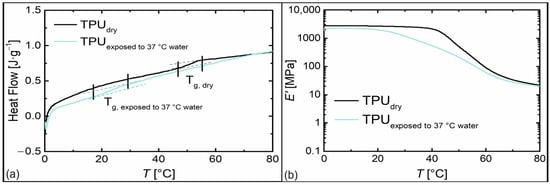 In the next step, the influence of storage conditions in 37 °C water on the material was investigated. In this regard, water uptake of the TPU by 2.3 wt% was verified after three days. Subsequently, DSC and DMA measurements were conducted to analyze the impact on thermal and thermomechanical properties (Figure 4).