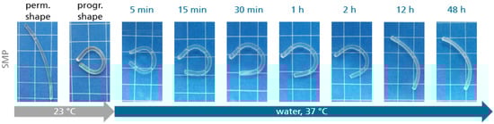 It can be clearly seen that recovery into the permanent shape was possible within 20 h. It is noteworthy that the release of programmed recovery forces directly in the oral cavity by contact with water, but possibly also by saliva, appears to be an interesting alternative to conventional approaches in aligner orthodontics and requires further detailed investigation, e.g., the interaction of saliva with the material used. The detected water-responsiveness roughly correlated to the qualitative experiment on the filament (Figure 5). The fact that the introduced SMP is both thermo- and water-responsive is a significant advantage compared with the material behavior of standard polymers and leaves plenty of room for conceptual expansion in the field of aligner orthodontics.
