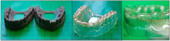 To demonstrate the principle of thermally switchable aligners, the SMP was injection molded and the resulting foil was used for thermoforming. As a counterpart, two dentures were fabricated via digital light processing (Figure 6). In detail, a denture model without malocclusion (targeted tooth position, Figure 6a, left) and a denture model with a misaligned incisor (actual tooth position, Figure 6a, right) were additively manufactured. Subsequently, the injection molded foil was deep-drawn (thermoformed) over the model shown in Figure 6a, left, to obtain an aligner exhibiting the optimum tooth position with the SMP being in its permanent shape (Figure 6b). Due to the amorphous soft segment of the TPU, the aligner was clear and not opaque. Subsequently, the aligner was heated above the glass transition temperature of the TPU and manually placed on the denture with a misaligned incisor (Figure 6a, right). After cooling to 23 °C, the temporary shape was fixed and a programmed aligner exhibiting the incisor malocclusion was received (Figure 6c).