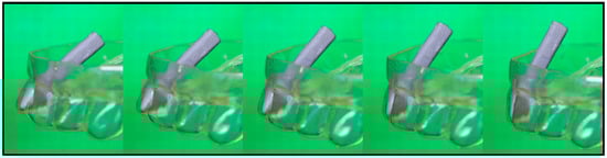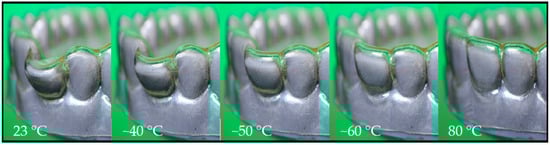 Now, the aligner was placed on a model denture with a loose incisor at the same position, at which the model showed tooth misalignment (Figure 6a, right), and was heated to 80 °C. The thermo-responsiveness of the aligner is shown in the image series of Figure 7 and the corresponding Video S1 movie in the Supplementary Materials.
