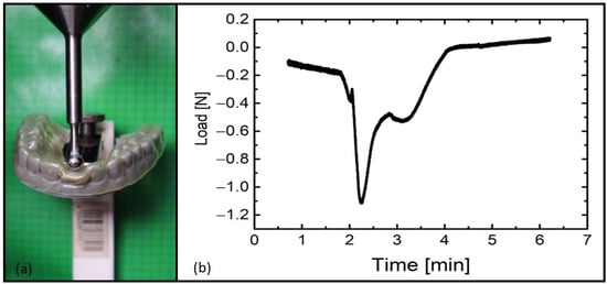 As a result of heating from 23 °C to 80 °C, the aligner corrected the displacement of the incisor while the position of the pin changed (Video S2). By subtracting the angles of the pin position in the temporary shape of the aligner (Figure 8, left) and in its recovered shape (Figure 8, right), a tipping angle of 22° could be estimated. Therewith, the incisor movement and correction of the displacement could be calculated by an arc length of about 3.5 mm. Although the incisor to be moved in the denture model did not offer significant resistance when the shape memory effect was thermally triggered, it can be assumed that the technology may also enable tooth movement in vivo []. To obtain a first indication of this, another experiment was conducted (Figure 9). The shape recovery force was measured with the force sensor of a tensile testing machine, which touched the programmed aligner (Figure 7, left) at the position of the misaligned tooth, and changes in axial load were followed (Figure 9a). It turned out that the aligner exerted a force of approximately 1.1 N when triggering the SME (Figure 9b).