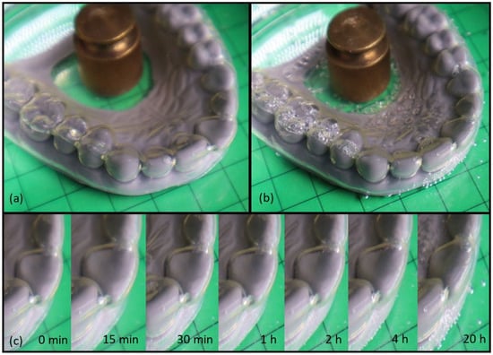 Water-responsiveness of a programmed TPU aligner with a misaligned incisor in 37 °C water (the weight prevented buoyancy). (a) A programmed aligner (0 min in a water bath), (b) a recovered aligner after storage for 20 h in a water bath, (c) a time-lapse activation of the shape memory effect depicted by the enlarged section of the incisor.