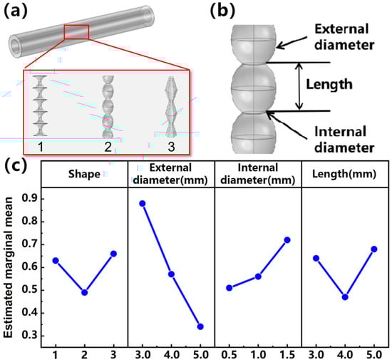 (a) Schematic diagram of three structures. (b) Structural parameters of the shape. (c) Results of orthogonal experiment.