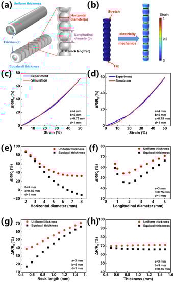 In order to grasp the influence of each structural parameter on the change in resistance during stretching, control experiments of the finite element simulation are carried out on them. Figure 2e shows the effect of the change in horizontal diameter (a) on the change in resistance in stretching (50%) when the longitudinal diameter (b) is 5 mm, the neck length (c) is 0.75 mm, and the thickness (d) is 1 mm; the change in resistance decreases with the increase in the horizontal diameter (a). Figure 2f shows that when the horizontal diameter (a) is 3 mm, the neck length (c) is 0.75 mm, and the thickness (d) is 1 mm, the change in longitudinal diameter (b) has an effect on the change in resistance when stretching (50%). The change in resistance decreases first and then increases with the increase in longitudinal diameter (b). There is an optimal value to minimize the change in resistance. Figure 2g shows that when the horizontal diameter (a) is 3 mm, the longitudinal diameter (b) is 5 mm, and the thickness (d) is 1 mm, the change in resistance during stretching (50%) increases with the increase in the neck length (c). Figure 2h shows that when the horizontal diameter (a) is 3 mm, the longitudinal diameter (b) is 5 mm, and the neck length (c) is 0.75 mm, the change in the thickness (d) during stretching (50%) has little effect on the change in resistance, which is basically negligible compared to several other parameters. It can be seen from the diagram that the structure of equiwall thickness is more stable than that of the uniform-thickness structure under the same structural parameters, so when preparing samples for practical application, the linear bunch three-dimensional conductive network structure with equiwall thickness is selected.